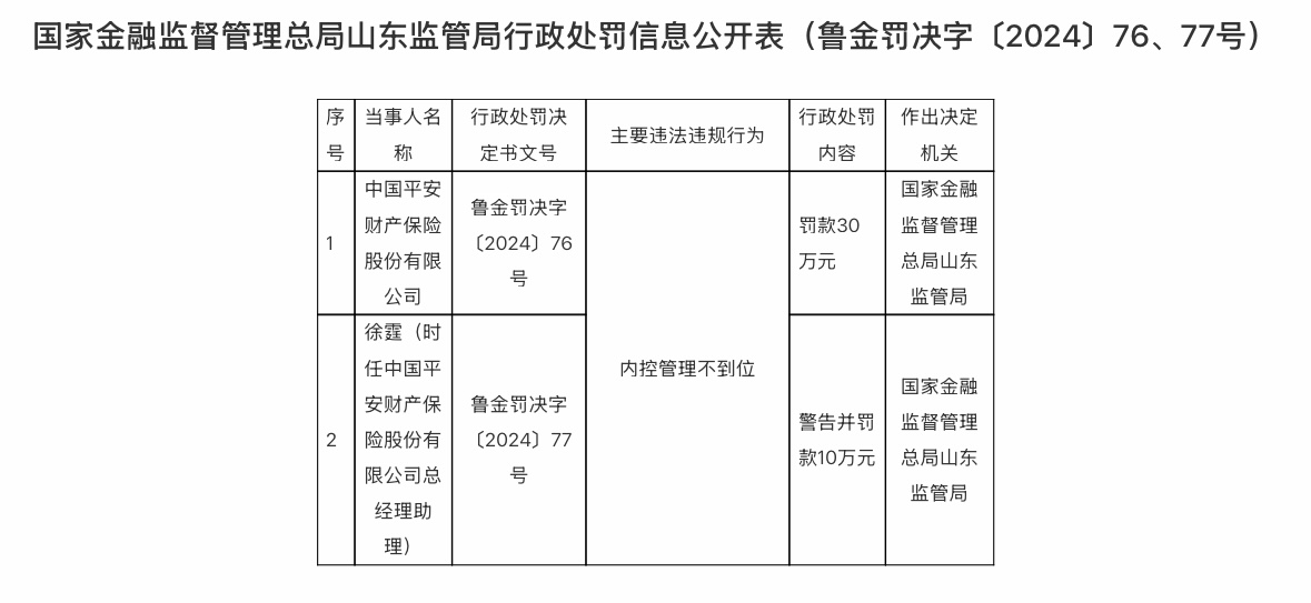 中国平安财产保险股份有限公司“内控管理不到位”被山东监管局罚款30万元;