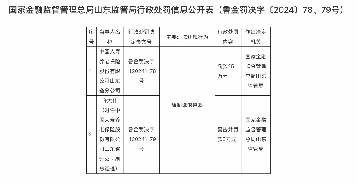 中国人寿养老保险股份有限公司山东省分公司“编制虚假资料”被山东监管局罚款25万元;