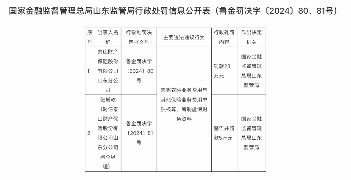 泰山财产保险股份有限公司山东分公司“未将农险业务费用与其他保险业务费用单独核算,编制虚假财务资料”被山东监管局罚款23万元;