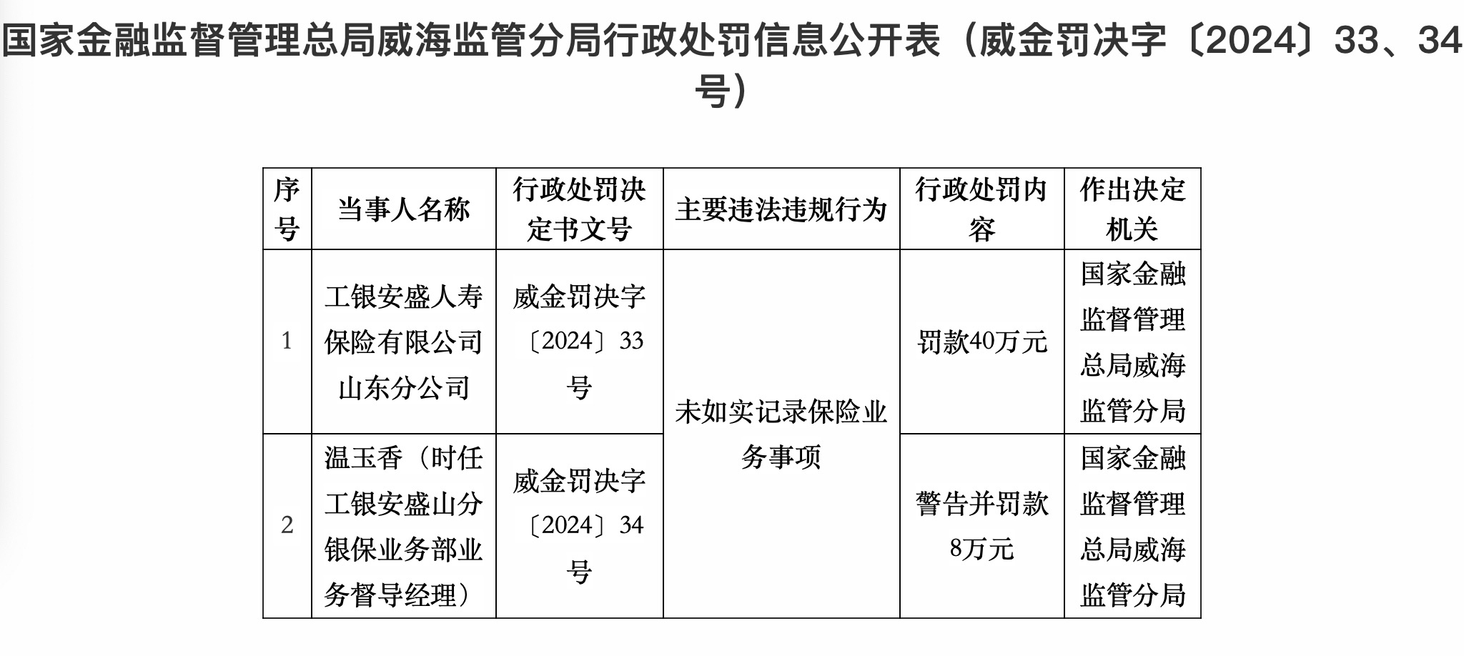 工银安盛人寿保险有限公司山东分公司“未如实记录保险业务事项”被威海监管分局罚款40万元;