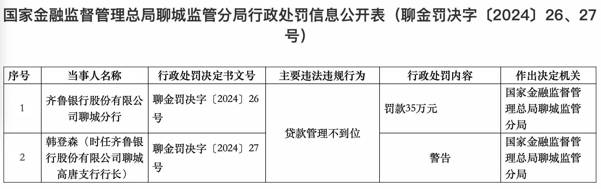 齐鲁银行股份有限公司聊城分行“贷款管理不到位”被聊城监管分局罚款35万元;