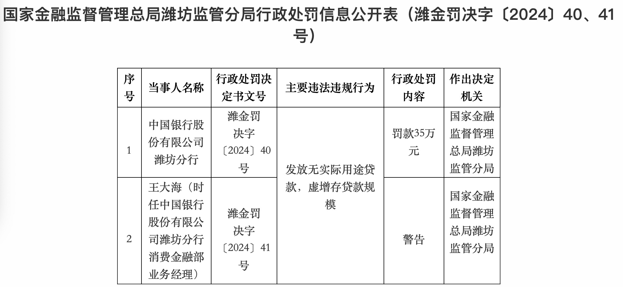 中国银行股份有限公司潍坊分行“发放无实际用途贷款,虚增存贷款规模”被潍坊监管分局罚款35万元;
