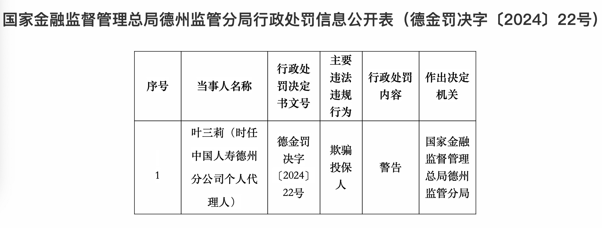 时任中国人寿德州分公司个人代理人叶三莉“欺骗投保人”被德州监管分局警告。