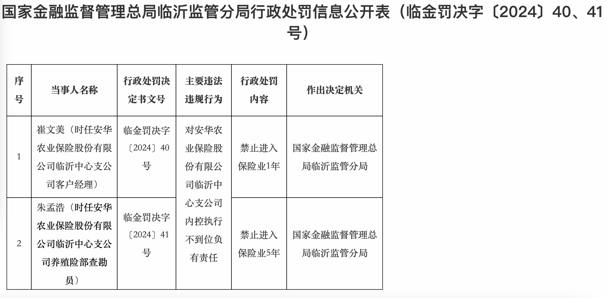 时任安华农业保险股份有限公司临沂中心支公司养殖险部查勘员朱孟浩“对安华农业保险股份有限公司临沂中心支公司内控执行不到位负有责任”被临沂监管分局禁止进入保险业5年。