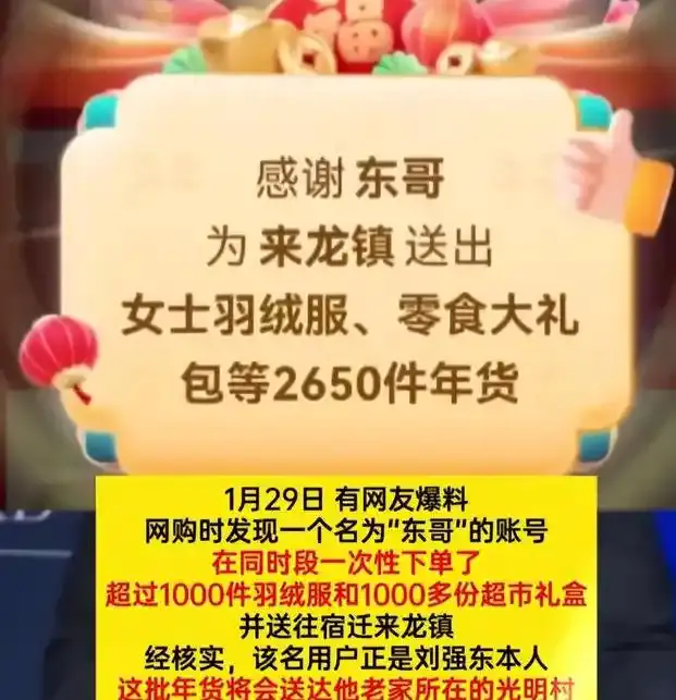 2024年1月,有网友发现,网购时发现一个名为“东哥”的账号在同时段一次性下单了超过1000件羽绒服和1000多份超市礼盒,并送往宿迁来龙镇。经核实,该名用户正是京东创始人、董事局主席刘强东本人,这批年货将会送达他老家所在的光明村,该村有1300多户村民,每家人手一份!