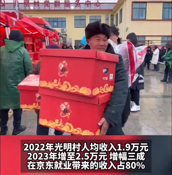 据了解,2022年光明村人均收入1.9万元,2023年增至2.5万元,增长30%以上。其中,在京东就业带来的收入占80%。