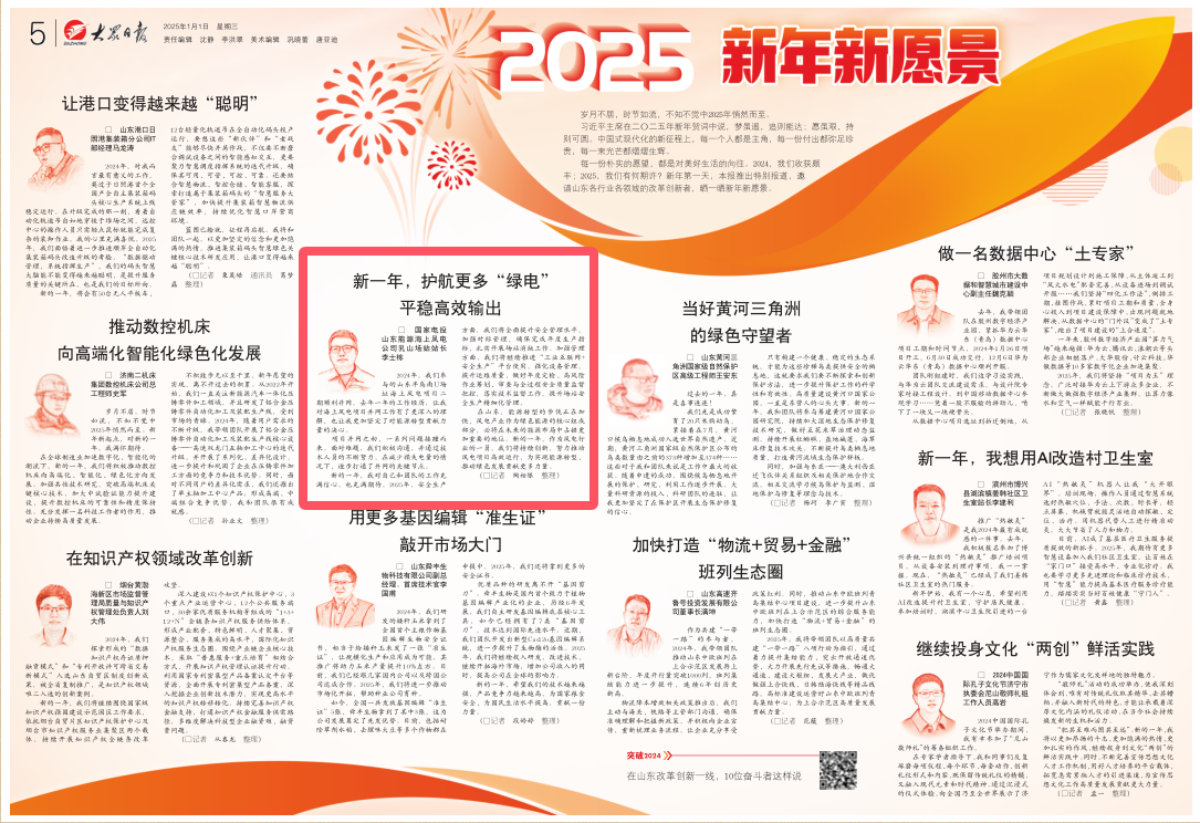 元旦当天,大众日报要闻版以两个整版篇幅推出特别报道,邀请山东各行业各领域的改革创新者,晒一晒新年新愿景。其中,国家电投山东能源海上风电公司乳山场站站长李士栋表示——新一年,护航更多“绿电”平稳高效输出。