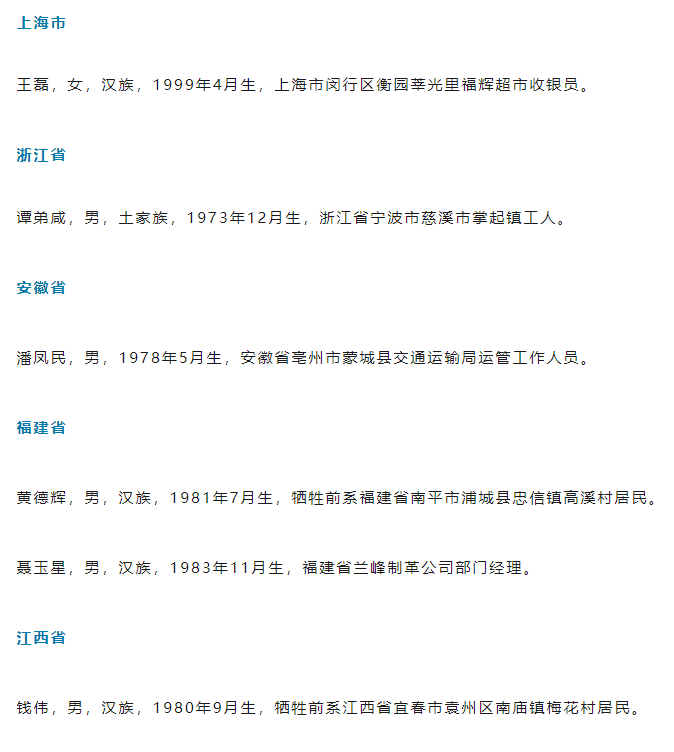 据介绍,上榜的见义勇为勇士有在公共场所挺身而出制服持刀伤人犯罪嫌疑人的左建国、黄树焘、王宇、王磊、聂玉星、何舰、兰程文等,左建国英勇牺牲;有驾车顶住失控越野车,阻止冲撞人群,避免重大安全事故发生的杜志军;有跳入江河、水库深水区锲而不舍连续救出几名落水群众的钱伟、杜强、牛文义、谭弟咸等,钱伟英勇牺牲;