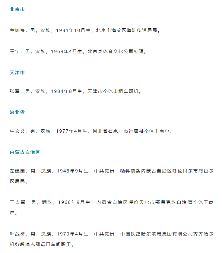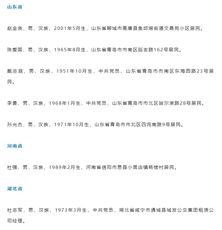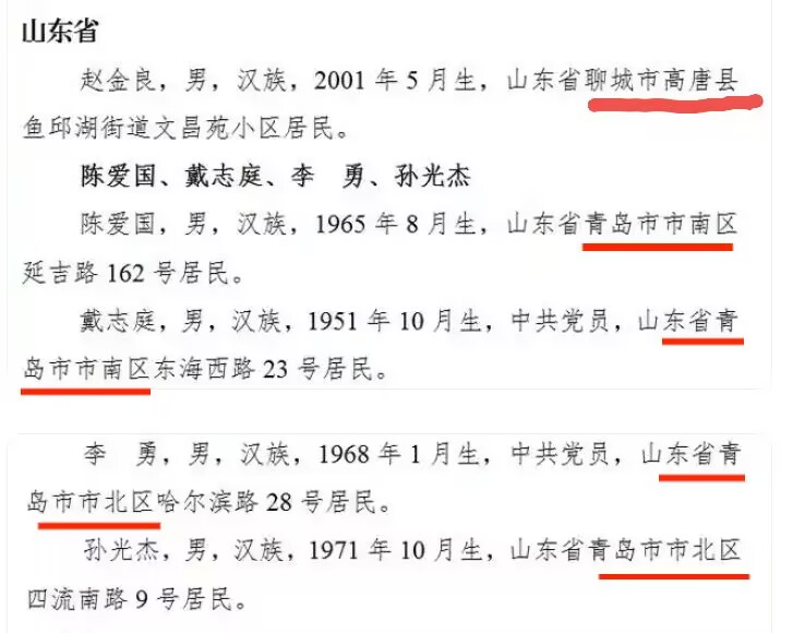 其中,山东省5人上榜,分别是聊城市高唐人赵金良,青岛市南区陈爱国、青岛市南区戴志庭、青岛市北区李勇、青岛市北区孙光杰。