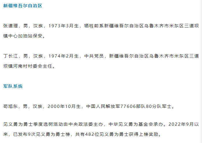 2025年1月3日,中央政法委在京发布2024年第四季度见义勇为勇士榜。据网络关注度和各地各单位推荐意见进行综合评审,共有42位见义勇为勇士光荣上榜。