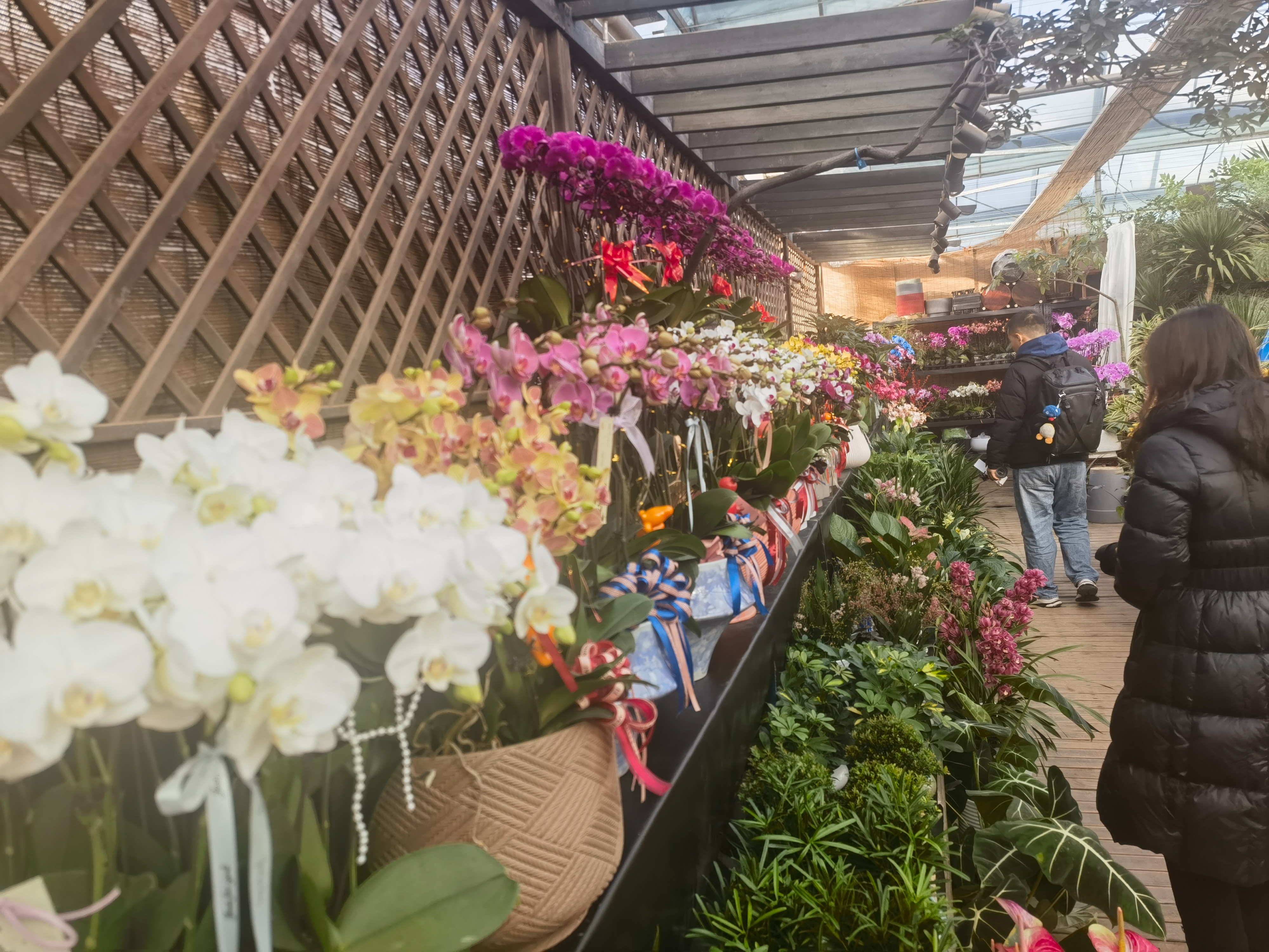 今年大部分花卉价格比往年低。不少经营者通过有创意的装盆和造型来提升花卉的附加值。秦海玲正将熔岩、君子兰、波士顿菊等多种植物搭配组合到一起,通过花期搭配、设计造型,使其更具观赏价值,让人眼前一亮。大花蕙兰外,蝴蝶兰、君子兰、观赏凤梨、金玉满堂等各类花卉盆栽也已上架,各色花卉在温暖的花房中竞相绽放,惊艳了前来选购的顾客,也增添了几分节日气息。