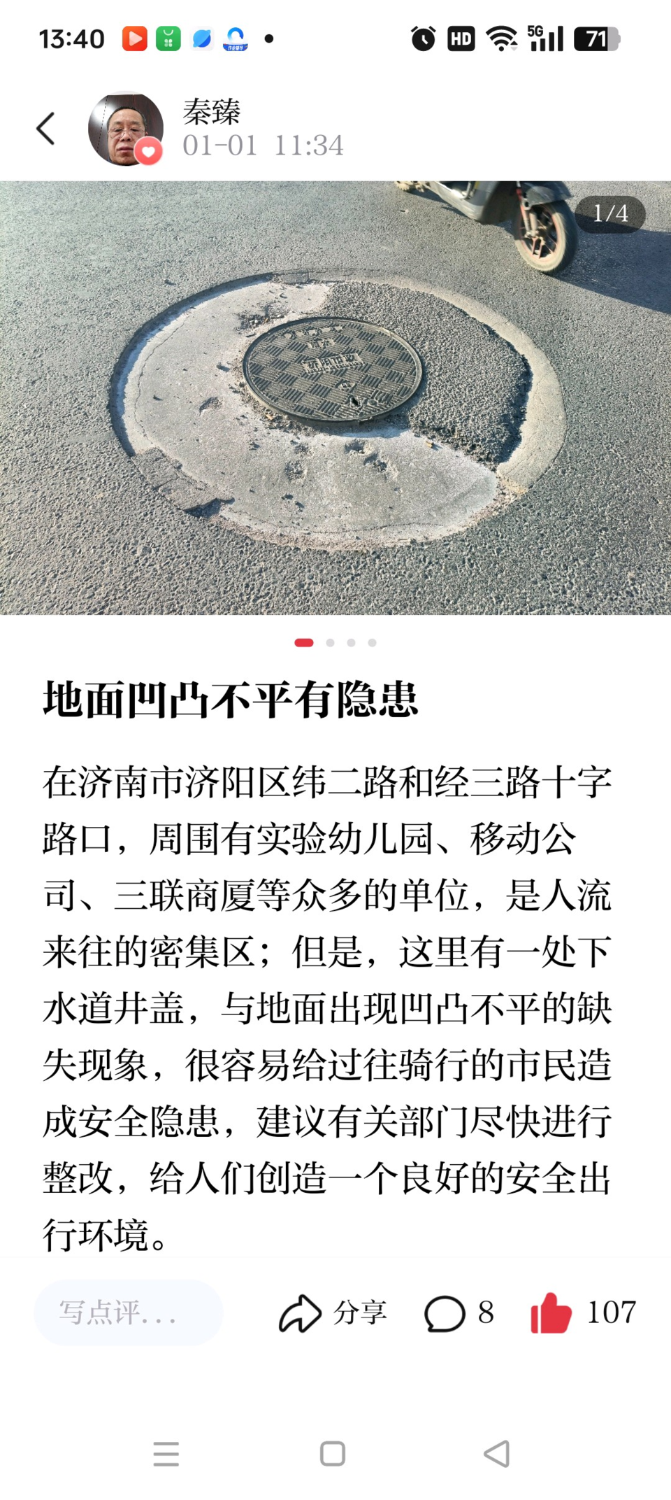 原来在1月1日,“秦臻”向齐鲁壹点情报站发来求助称,位于济南市济阳区纬二路与经三路十字路口周边单位众多,人流密集,但存在一处下水道井盖与地面凹凸不平的缺失现象,给过往骑行的市民带来安全隐患,建议有关部门尽快整改,创造良好安全出行环境。