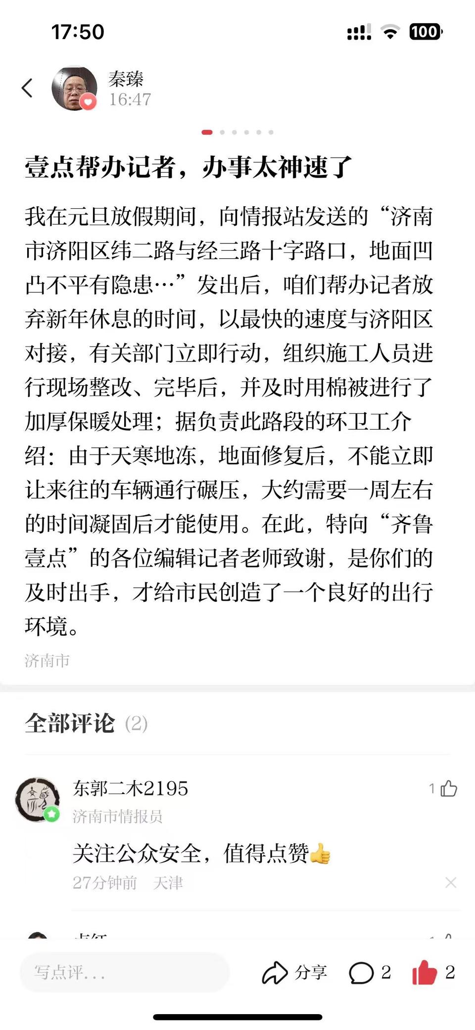 “据负责此路段的环卫工介绍,由于天气寒冷,地面修复后需大约一周时间凝固才能通行。在此,特向齐鲁壹点的各位编辑记者老师致谢,是你们的及时出手,为市民创造了一个良好的出行环境。”情报员说。