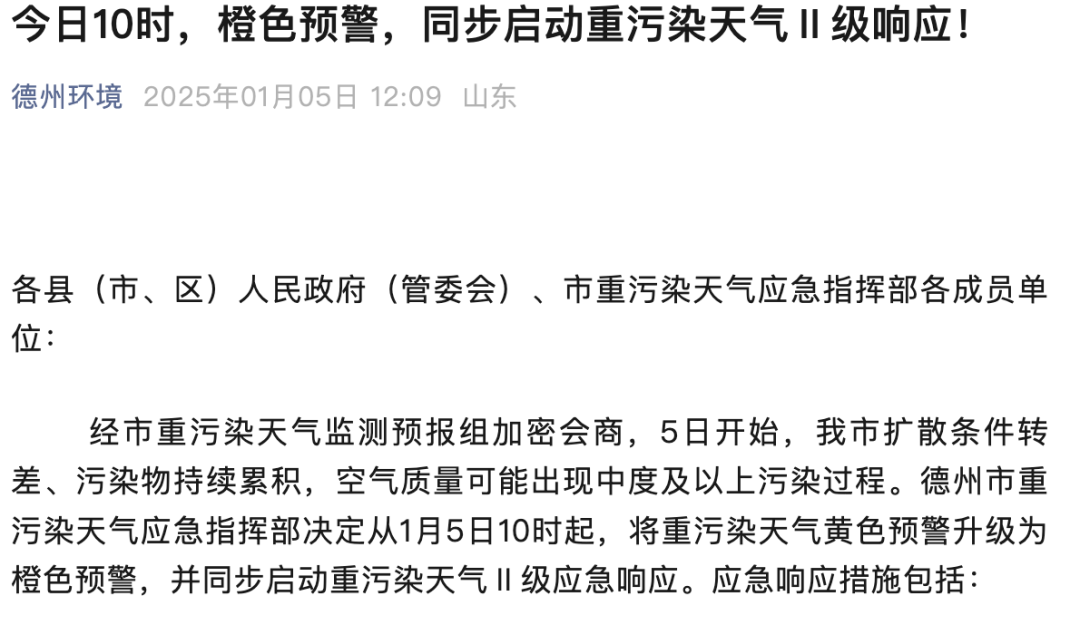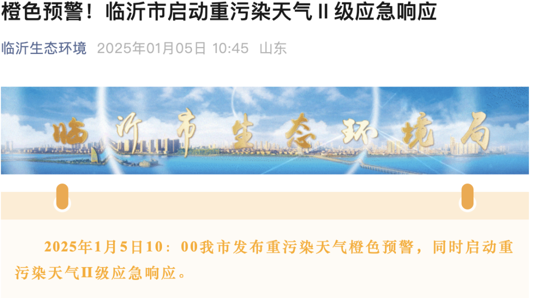 2025年1月5日10:00我市发布重污染天气橙色预警,同时启动重污染天气Ⅱ级应急响应。