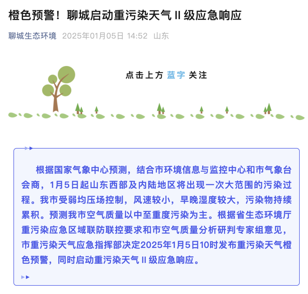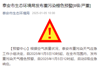 根据空气质量状况,泰安市重污染天气应急工作小组决定,自2025年1月5日10时起,在全市范围内,发布重污染天气橙色预警,自2025年1月5日12时起,启动Ⅱ级应急响应。
