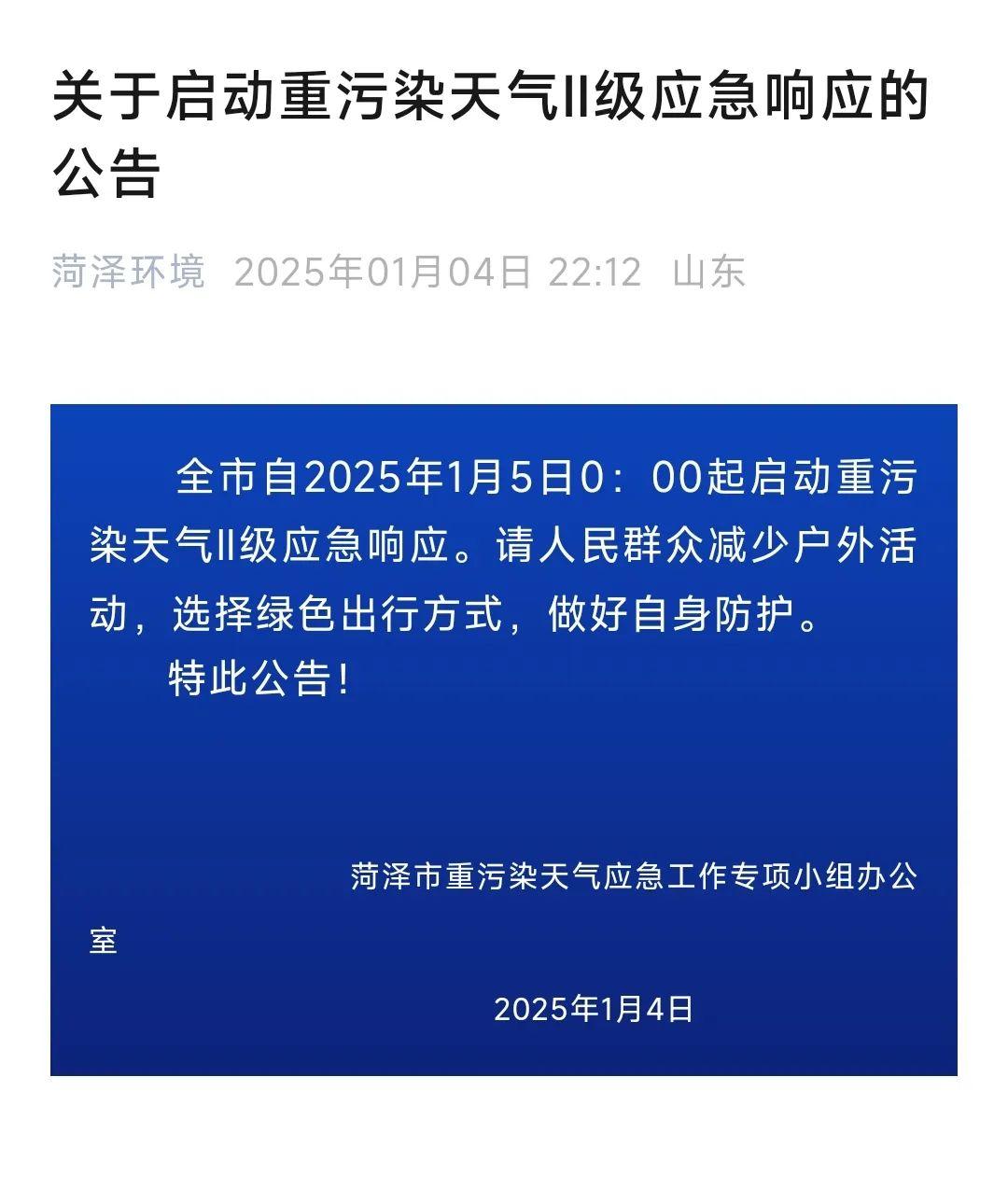 根据生态环境部空气质量预测预报情况和我市空气质量会商结果,受不利气象条件影响,我市将发生一次污染过程。按照应急联动要求,全市于2025年1月5日11时00分启动Ⅱ级应急响应。