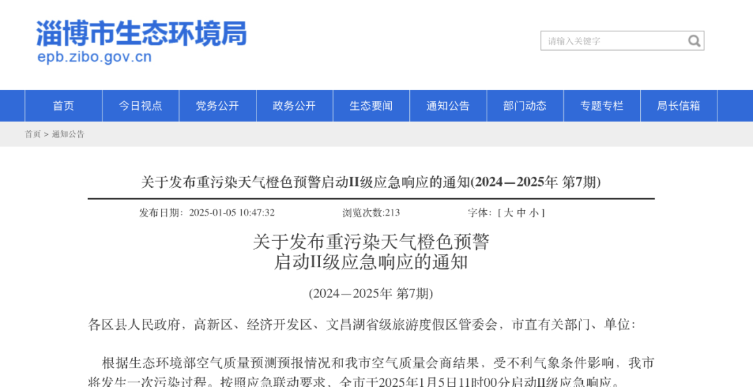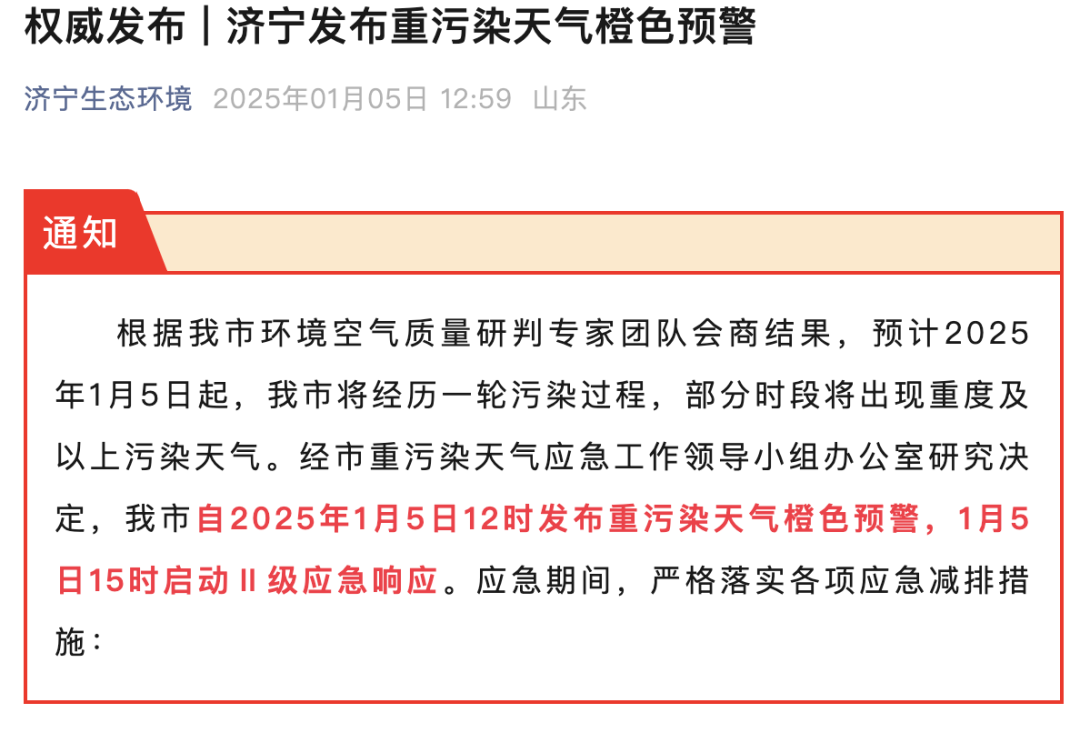 根据我市环境空气质量研判专家团队会商结果,预计2025年1月5日起,我市将经历一轮污染过程,部分时段将出现重度及以上污染天气。经市重污染天气应急工作领导小组办公室研究决定,我市自2025年1月5日12时发布重污染天气橙色预警,1月5日15时启动Ⅱ级应急响应。应急期间,严格落实各项应急减排措施。