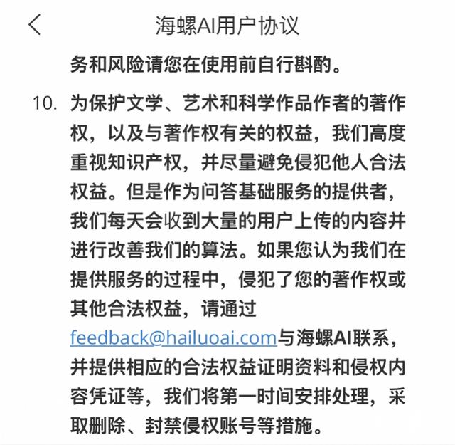 值得注意的是,MiniMax在旗下海螺AI的用户协议中还提到,“为保护文学、艺术和科学作品作者的著作权,以及与著作权有关的权益,我们高度重视知识产权,并尽量避免侵犯他人合法权益。但是作为问答基础服务的提供者我们每天会收到大量的用户上传的内容并进行改善我们的算法。如果您认为我们在提供服务的过程中,侵犯了您的著作权或其他合法权益,请与海螺AI联系并提供相应的合法权益证明资料和侵权内容凭证等,我们将第一时间安排处理,采取删除、封禁侵权账号等措施”。
