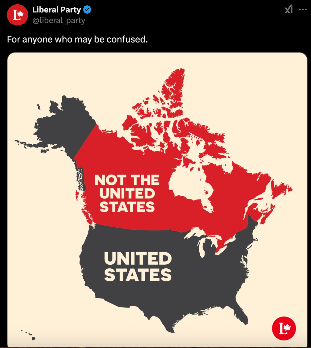 报道称,在这篇帖文中,加拿大自由党用红色标记出加拿大领土轮廓,配文“非美国(领土)”,并用深灰色标记出美国的轮廓,配文“美国(领土)”。帖文文字还写道,“给那些可能搞混的人”。