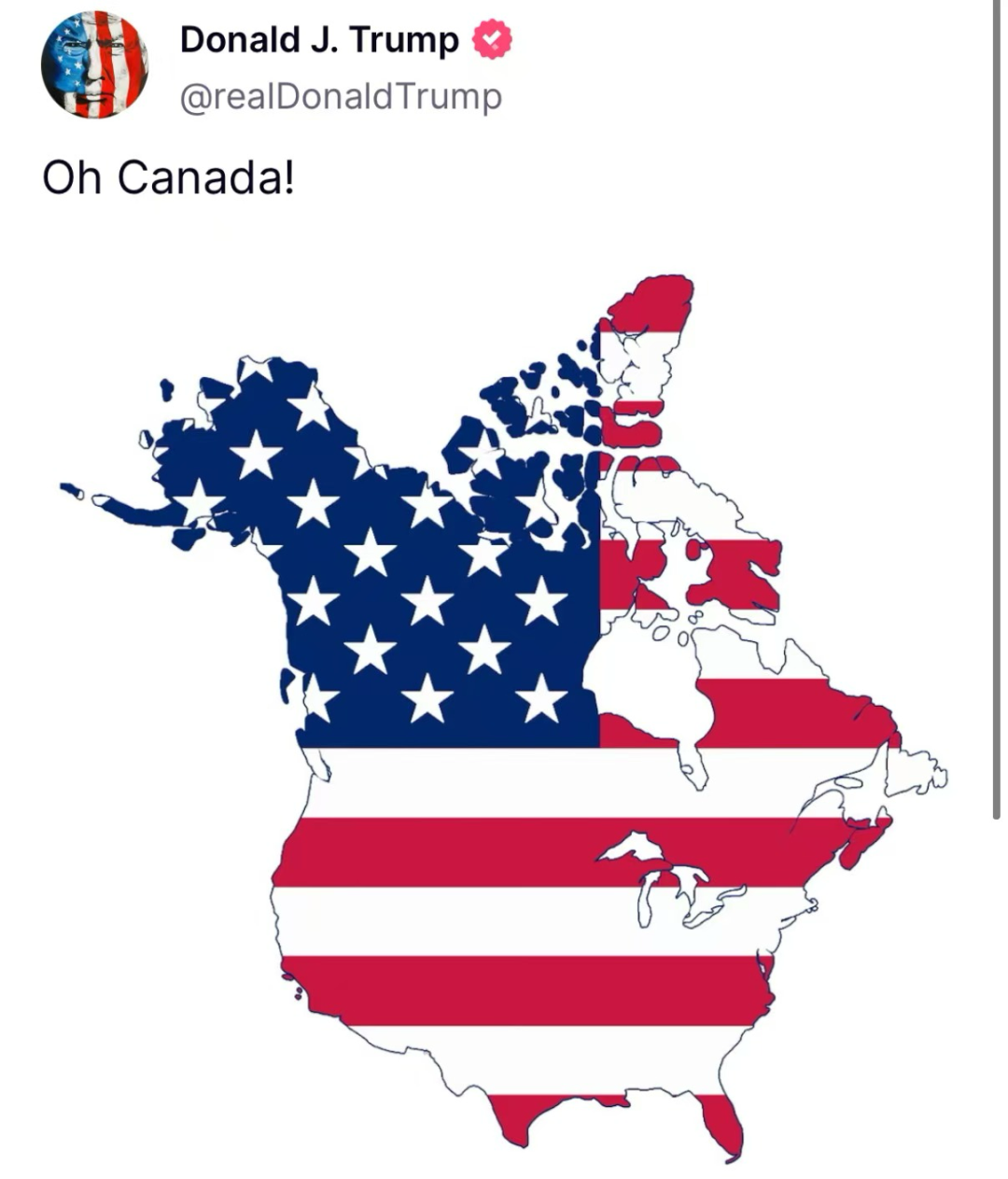 当地时间7日,特朗普在一条帖文配图中将美国和加拿大领土“合并”,并为“全新版图”填充上美国国旗图案。图源:特朗普社交平台账号截图