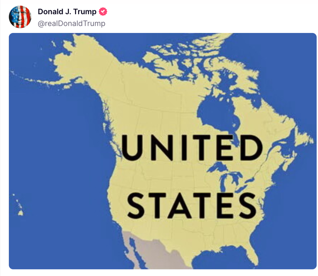 当地时间7日,特朗普在其自创社交平台发布一张“加拿大被纳入美国”之后的“美国全新版图”。图源:特朗普社交平台账号截图
