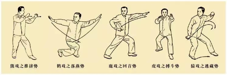 五禽戏:模仿虎、鹿、熊、猿、鸟(鹤)五种动物的动作,是一种外动内静、动中求静、动静俱备、有刚有柔、刚柔相济、内外兼修的仿生功法。