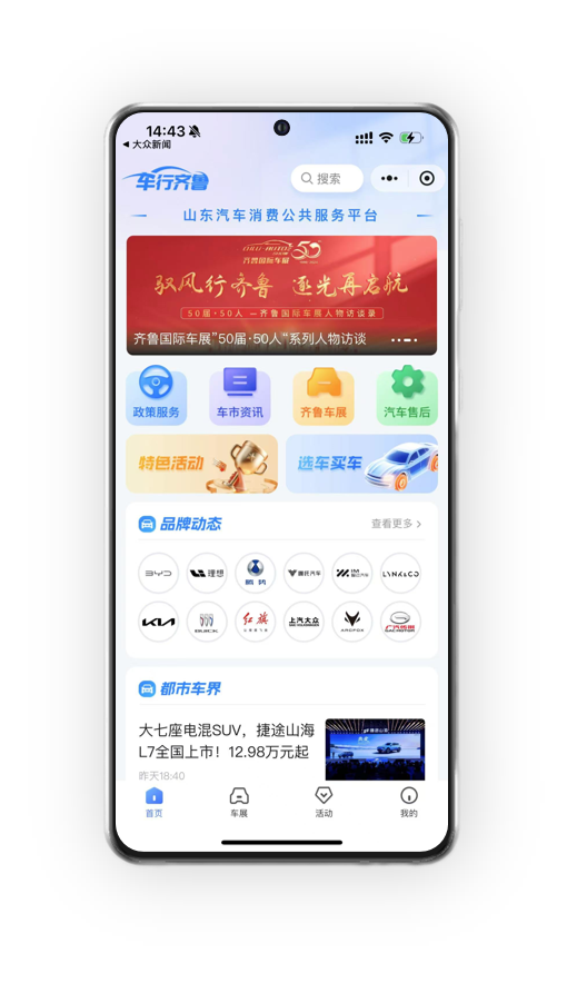 车行齐鲁是山东汽车消费公共服务平台,由山东省商务厅、大众报业集团指导,齐鲁晚报·齐鲁壹点主办。大平台围绕山东消费者关注的汽车消费和资讯、以旧换新、汽车下乡、维修保养等重点板块,将政策、企业、消费者三者紧密联系在一起,一键解决汽车消费、流通过程中出现的各类问题,为消费者做好公共服务,为企业做好市场赋能,为产业做好数据支撑。