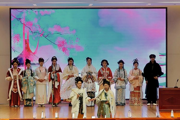 活动当天,曹县电商的“明星”产品汉服与长清区双泉镇的白木耳、新小米、豆腐皮等特色农副产品精彩亮相。尤为引人注目的,曹县带来的汉服走秀,仿佛带着师生们穿越了悠悠岁月,徜徉在中华文明的历史长河中。优雅精美的汉服吸引了众人的目光,将现场气氛一次次推向高潮。