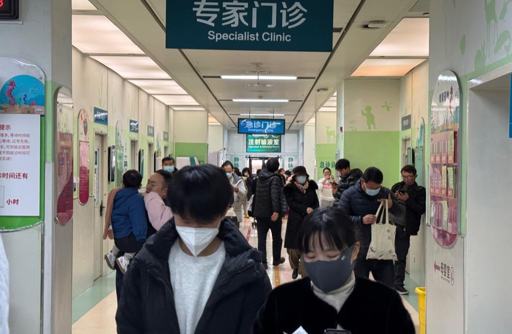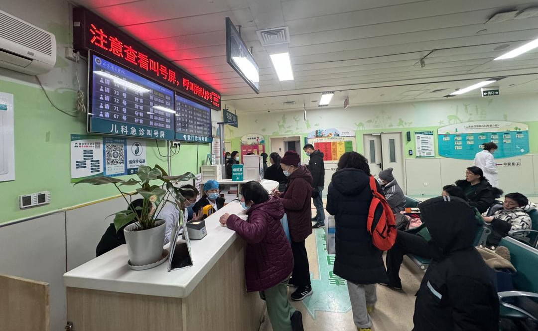 2025年1月9日早9点,山东第一医科大学附属省立医院(山东省立医院)奥体院区儿科候诊大厅内人头攒动,座椅上坐满了患儿和家长,一些孩子额头上贴着退热贴,咳嗽声此起彼伏。