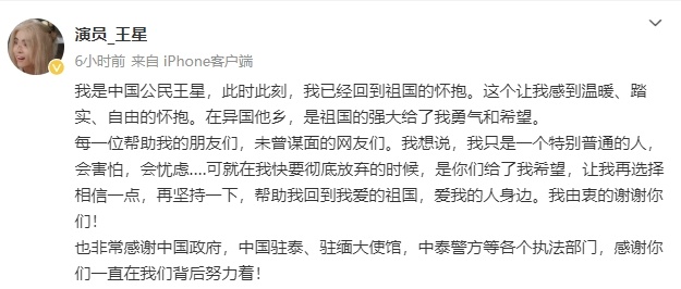 11日3时56分,王星发文报平安,向祖国表达感激之情:“我是中国公民王星,此时此刻,我已经回到祖国的怀抱。这个让我感到温暖、踏实、自由的怀抱。在异国他乡,是祖国的强大给了我勇气和希望。”