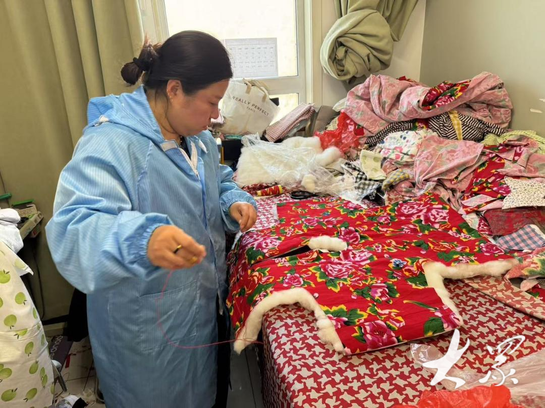 走进娄茜的家,首先映入眼帘的,是满客厅的布料、棉袄。除了一个卧室,家中其余空间全部被她改造成了棉衣制作工作室。