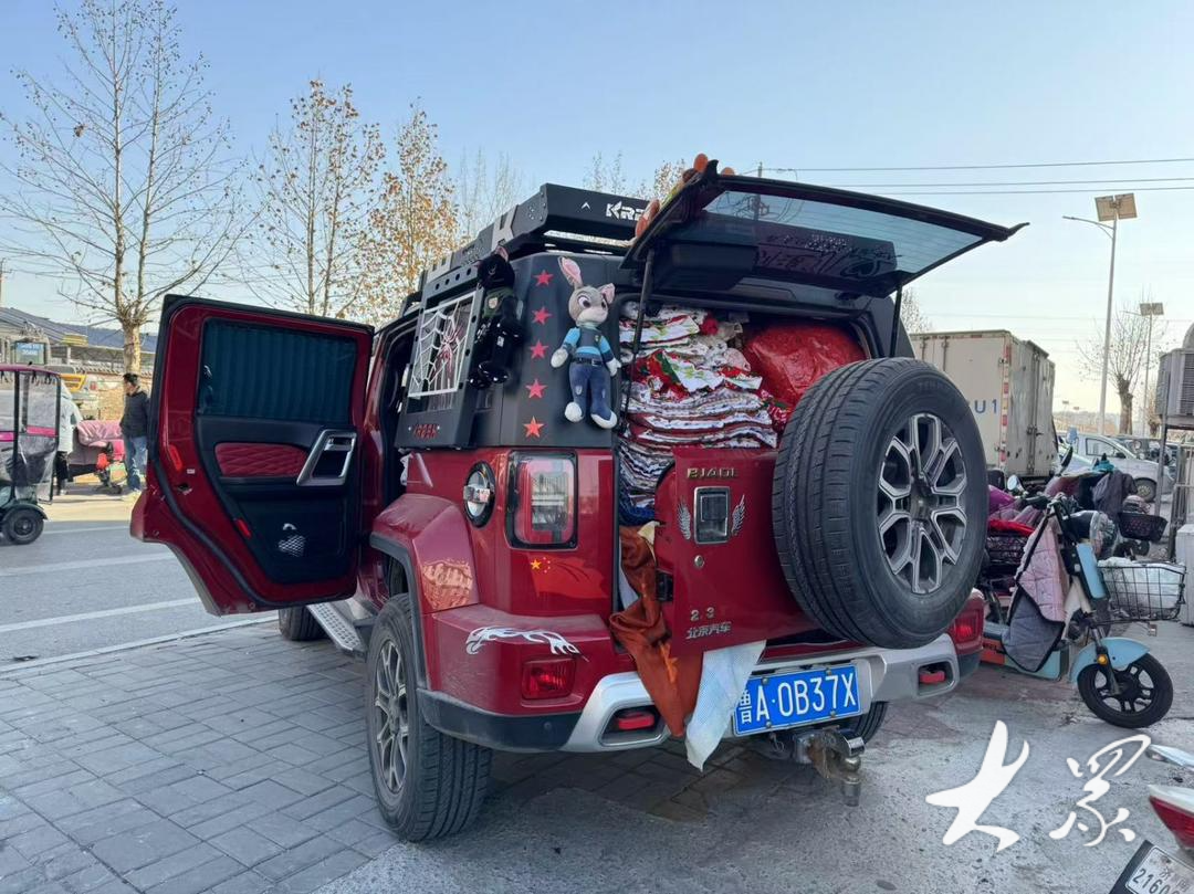 2025年1月10日,历城区郭店大集的北头,有这样一个摊位:一位年轻的大姐开着越野车摆摊卖棉衣,其棉袄都是手工做,主打一个经济实惠+小清新。记者蹲点观察发现,半小时内,这位大姐卖出10余件棉衣,每件价格30至80元不等。
