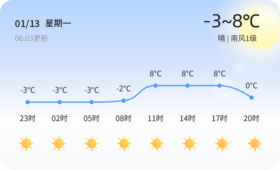 2025年1月13日,农历十二月十四,潍坊迎来了晴朗的一天,但气温较低,最低气温达到了-3℃,最高气温也仅为8℃。今天的风向为南风1级,空气质量因PM2.5浓度为99微克/立方米而略显不佳,属于轻度污染。市民朋友们在外出时需注意防寒保暖,并佩戴口罩以减少霾对身体的影响。同时,由于天气晴朗,紫外线较强,也请做好防晒措施。