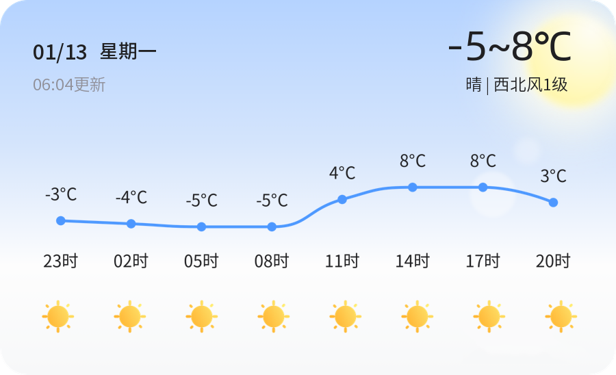 【泰安1月13日讯(农历十二月十四)】今日泰安天气晴朗,气温在-5℃至8℃之间波动,西北风1级轻轻吹拂,空气湿度达到77%,给干燥的冬日带来一丝润泽。空气质量方面,PM2.5浓度为69微克/立方米,属于良好级别,空气质量较为清新,适宜市民外出活动。但早晚温差较大,建议市民朋友们适时增减衣物,佩戴口罩防护,同时注意防寒保暖,确保身体健康。