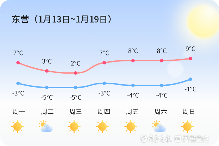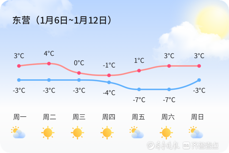 全市周平均最高温6℃,平均最低温-3℃,平均气温1℃,周最高气温9℃,出现在周日,周最低温-5℃,出现在周二、周三。