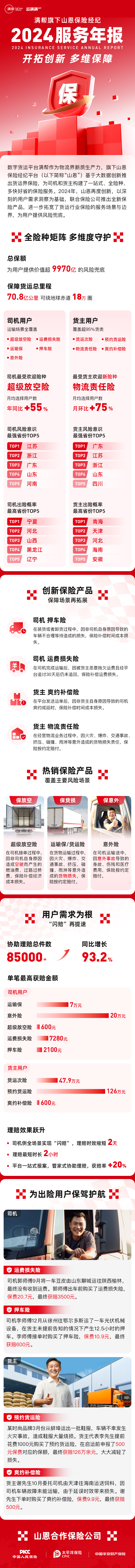 除了创新险种的不断推出,山恩还在服务上不断提质提速。2024年度协助理赔总件数达到85000件,同比增长93.2%,再创新高。2024年,司机侧全场景实现“闪赔”,理赔时效缩短2天,理赔最短时长仅仅2小时,一站式报案,管家式协助理赔,助力用户获赔率大幅提升20%。