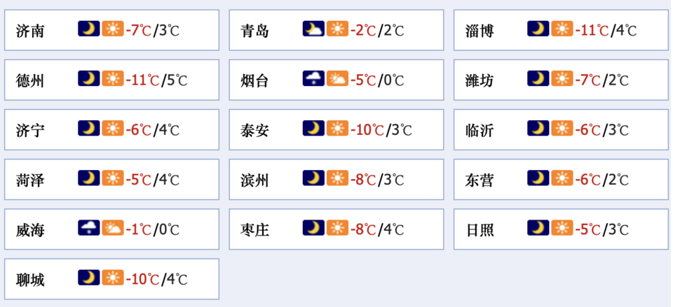 最低气温:鲁中山区-9℃左右,沿海地区-3℃左右,其他地区-7℃左右。