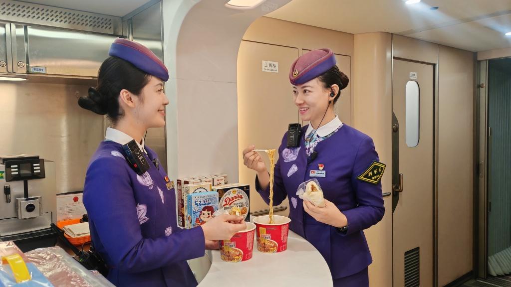 列车上的乘务人员实行“上三天休三天”的工作制度,“上下班没有固定时间,要根据列车的时间来定,列车休息,我才能休息。”白俊来开玩笑地说。