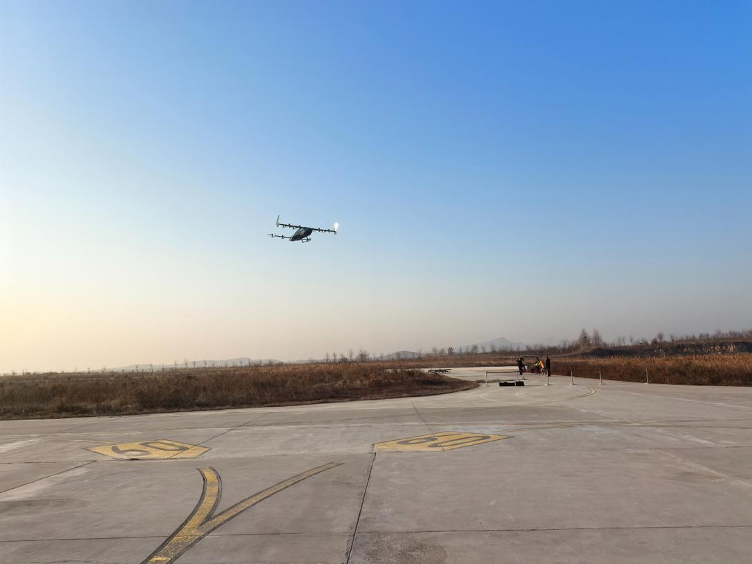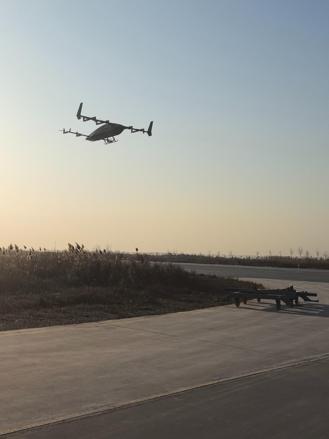 几分钟后,塔台传来了“可以起飞”的指令。在工作人员的远程操控下,飞行器的旋翼高速运转起来,紧接着离开地面迅速往上爬升并加速向前方飞去,很快消失在视线中。不一会儿,远处传来嗡嗡声,飞行器返回机场上空,在四周盘旋数圈后,最终稳稳地降落在跑道上,整个试飞过程大约20分钟。