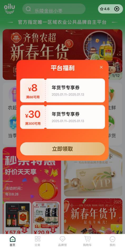 作为山东省区域农业公共品牌自主平台,“齐鲁农超”发挥自身优势,将此次滨州新春年货节的阵地“蔓延”到互联网上,实现线上小程序与线下实体展会同步办展。在“齐鲁农超”小程序上,特上线全平台可用的满88元减8元、满300元减30元的优惠券,让不能来到滨州年货节现场的消费者们也能享受到福利和好品。