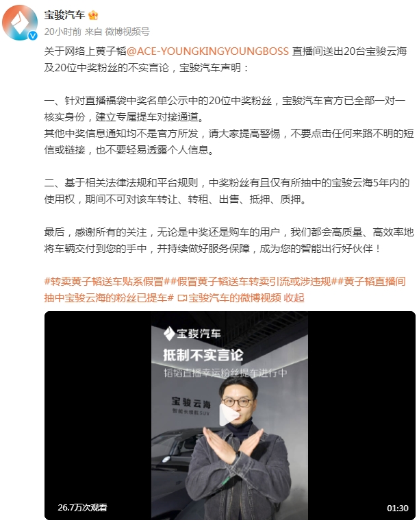 1月15日,针对黄子韬直播送车,有中奖者在二手平台转卖中奖车辆事件,宝骏汽车发布微博声明:针对直播福袋中奖名单公示中的20位中奖粉丝,宝骏汽车官方已全部一对一核实身份,建立专属提车对接通道。