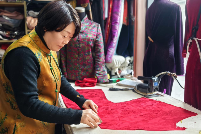 对于中式服装传统技艺第三代传承人胡秋兰来说,每年春节前都是她一年中最忙的时候。“经过多年研究,我们将传统非遗技艺与现代审美相结合,制作出了中式风衣、新中式等服装,越来越多的人希望穿中式服装过中国年。很多顾客从去年10月份就开始定做了春节的新衣服,宋锦布料最受欢迎。现在店里订单爆满,已经不接单了。”胡秋兰一边赶制顾客的“新年战袍”,一边向记者介绍道。