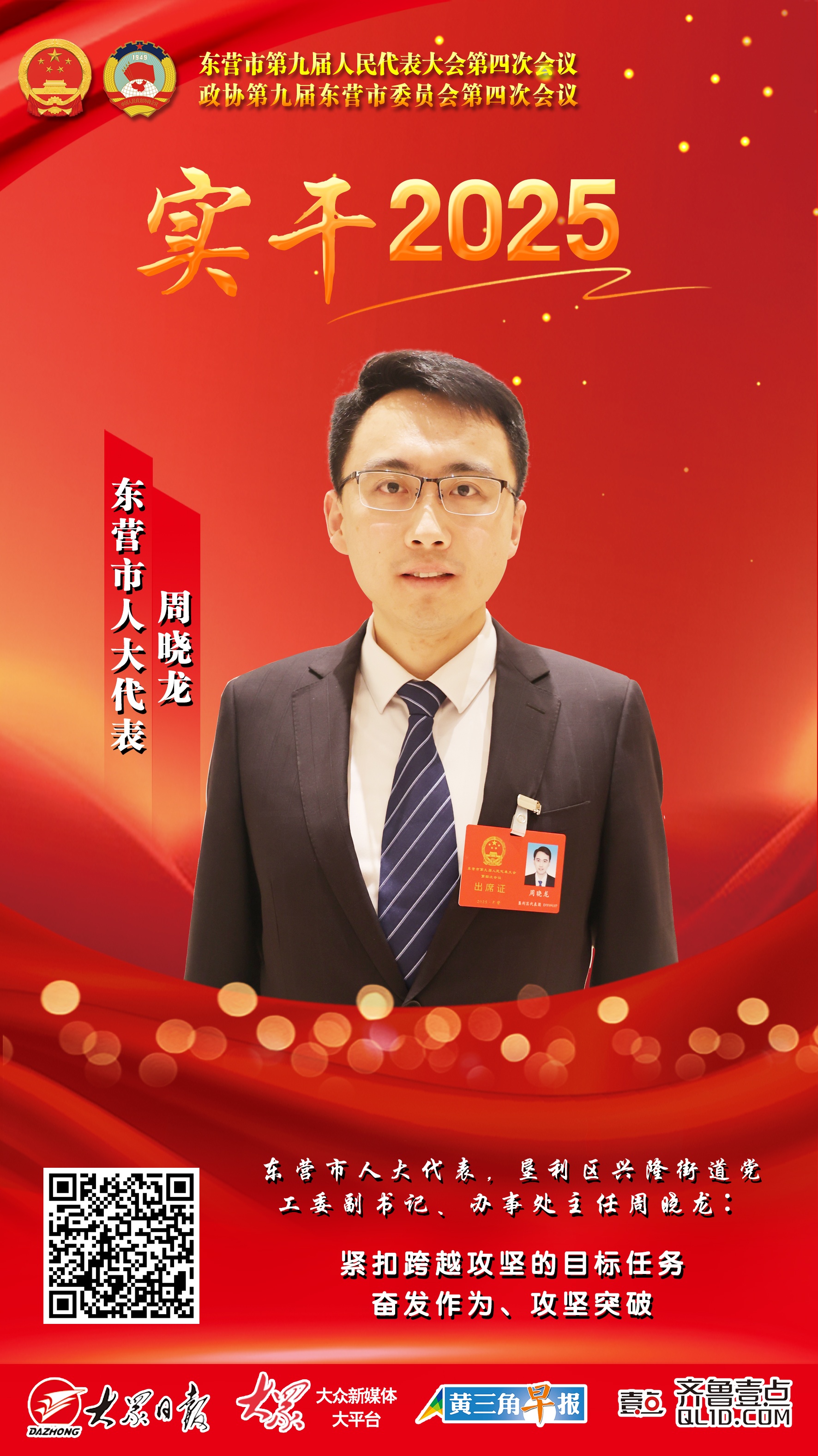 海报|东营市人大代表,垦利区兴隆街道党工委副书记、办事处主任周晓龙:紧扣跨越攻坚的目标任务 奋发作为、攻坚突破来源:大众新闻2025-01-17 13:18:00原创责任编辑:李广寅大众新闻原创内容,未经授权不得转载转载事宜请联系大众新媒体大平台 联系电话:0531-85193469