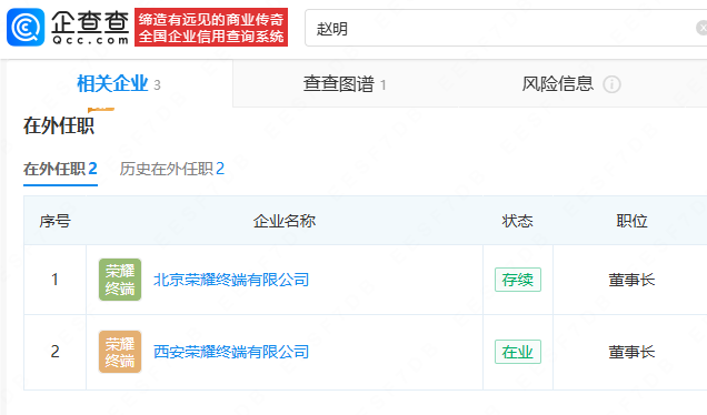 企查查APP显示,赵明曾担任荣耀终端股份有限公司董事、深圳市智信新信息技术有限公司总经理、董事职务。目前,赵明已卸任上述两家荣耀相关公司高管职务,仍担任北京荣耀终端有限公司、西安荣耀终端有限公司董事长职务。