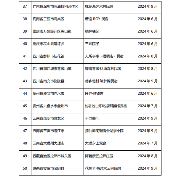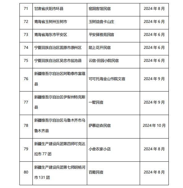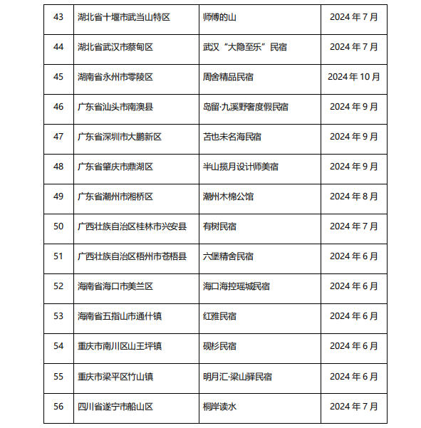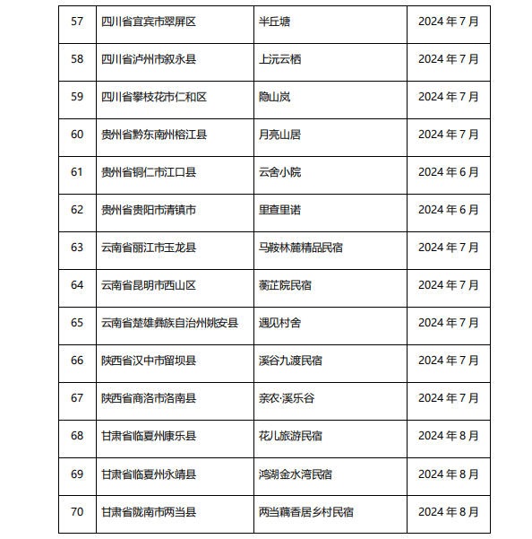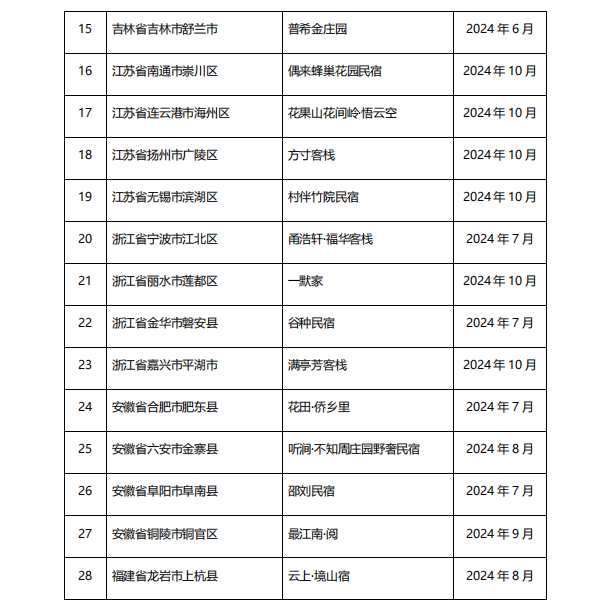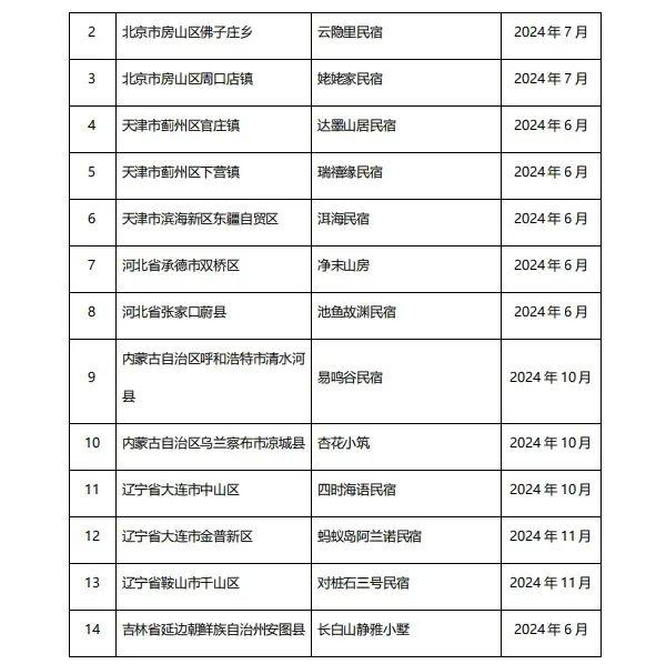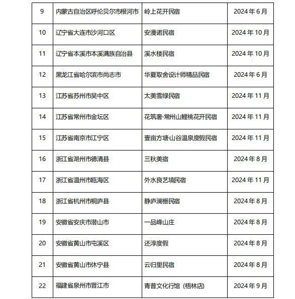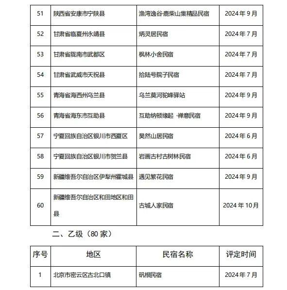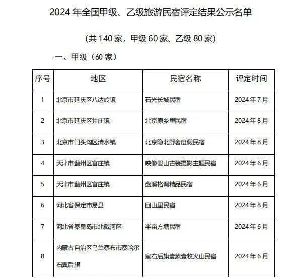 1月14日,全国旅游标准化技术委员会发布2024年全国甲级、乙级旅游民宿评定结果公示。