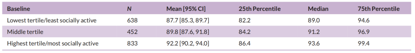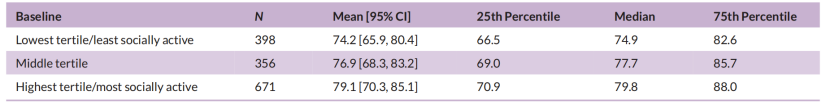 基线无MCI的1425名参与者中,有695名确诊MCI。社交活动与MCI风险降低24%有关,社交活动得分每增加一个单位,与MCI风险降低21%有关。根据模型估计,社交活动最低三分位数参与者MCI平均发病年龄为74.2岁,比最高三分位数人群早2年。