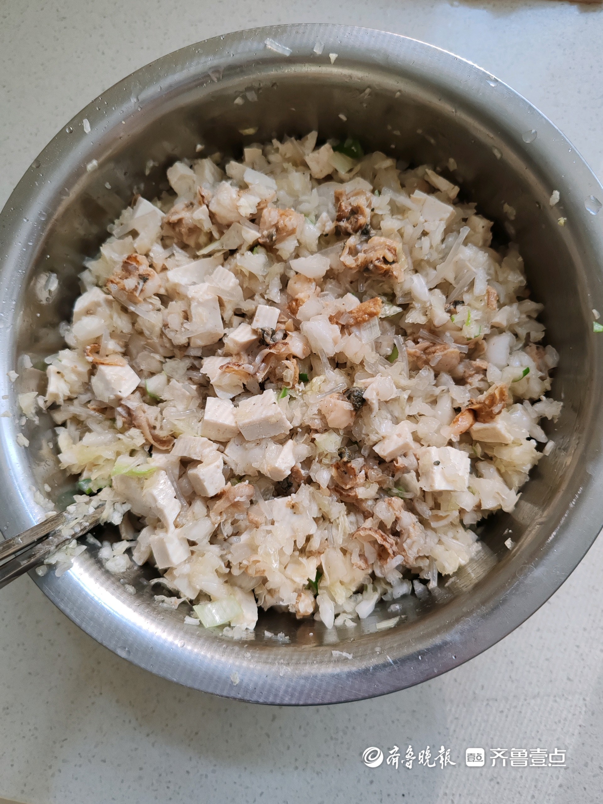 2.白菜最好用叶子,洗净控水剁碎,用过滤小袋子把水分过滤掉,放盆里备用;