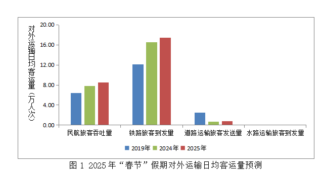 从时间分布来看,春节前客流高峰预计出现在1月25日(腊月二十六)、1月28日(除夕),节后客流高峰预计出现在2月4日(正月初七)、2月13日(正月十六)。从方式分布来看,预计旅客更多选择航空、铁路、自驾等出行方式。