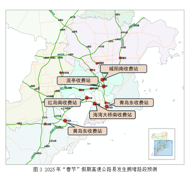春节假期,预计青岛市高速公路驶入驶出车辆将达到748.80万辆,日均93.60万辆。1月27日(腊月二十八)、2月4日(正月初七)预计会出现出行高峰,青银高速青岛东收费站、流亭收费站,胶州湾大桥海湾大桥南收费站、红岛南收费站,青兰高速黄岛东收费站,青新高速城阳南收费站附近区域易发生拥堵。省内车流辆主要来自潍坊、烟台、临沂、济南、日照、威海等城市;跨省车流主要来自江苏、河北、河南、辽宁、北京、上海等省市。