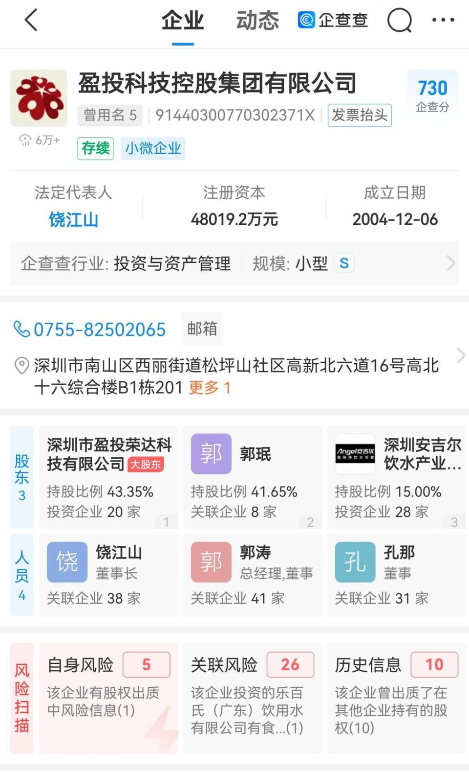 企查查显示,盈投集团由深圳市盈投荣达科技有限公司、郭珉、深圳安吉尔饮水产业集团有限公司共同持股,郭珉是该公司实际控制人。